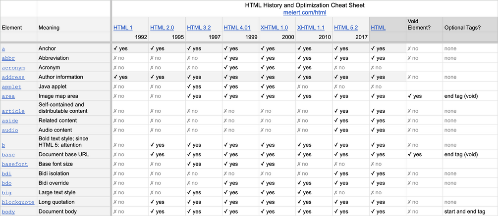 4 decades, 8 HTML specifications, 132 elements. What element has what meaning, has been part of what specification(s), is void, has an optional end and perhaps also an optional start tag?