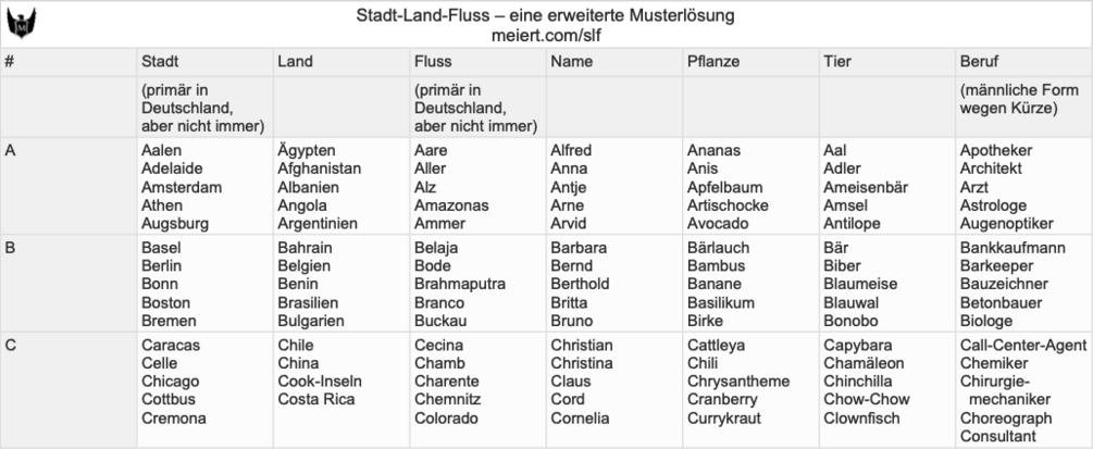 Bequem druckbares PDF mit bis zu 5 Lösungen pro Feld für Stadt-Land-Fluss (und -Name-Pflanze-Tier-Beruf)